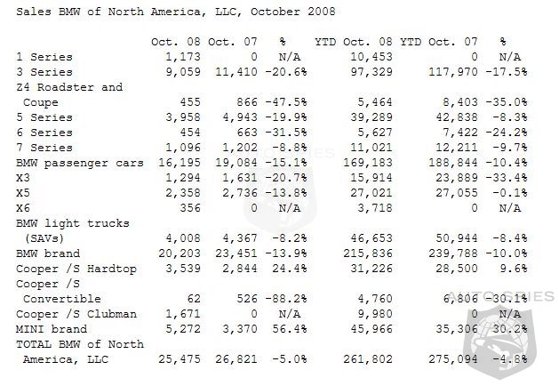 BMW Group US sales (BMW and MINI combined) down 5.0 percent in October. Woodcliff Lake, NJ - November 3, 2008... The BMW Group in the U.S. (BMW and MINI combined) reported October sales of 25,475 vehicles, a decrease of 5.0 percent over the 26,821 vehicles sold in October 2007. The BMW Group also reported a year-to-date sales volume of 261,802 vehicles, down 4.8 percent, compared to 275,094 vehicles in the same period of 2007.
