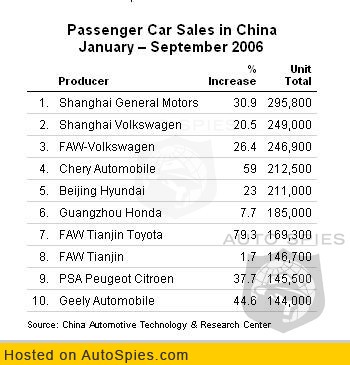 A quick glance at passenger-car sales in China for the first nine months of 2006 reveals some significant shifting in the rankings.