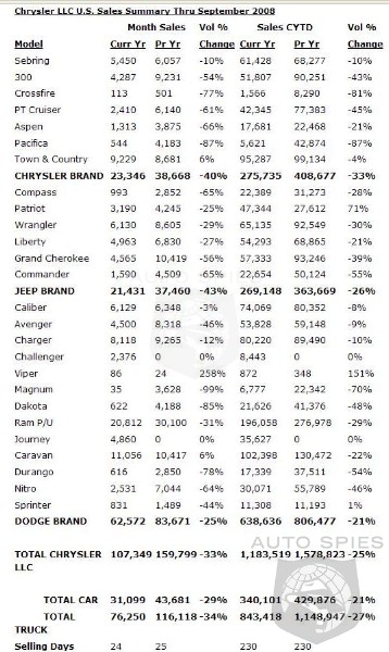Chrysler LLC today reported total September 2008 U.S. sales of 107,349 units, down 33 percent from the same period last year. Total September sales reflect a highly volatile economic environment, ongoing segment shifts and reduced fleet and lease volume. Sales for the month were supported by models such as the Dodge Journey, Dodge Grand Caravan, and Chrysler Town & Country, as well as competitive pricing and aggressive monthly payment offers. "The economy is going through a difficult restructuring, resulting in great uncertainty among consumers," Jim Press, Chrysler LLC Vice Chairman and President, said. “We are committed to supporting our customers with significant savings and innovative financing, and our dealers with new business solutions. Longer term, we all need to be investing in building a healthier automobile industry and be ready to compete when the economy strengthens.”