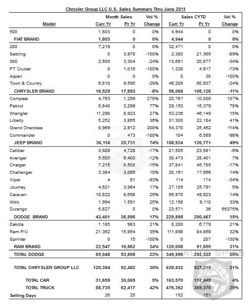Chrysler Group LLC today reported U.S. sales of 120,394, a 30 percent increase compared with sales in June 2010 (92,482 units), and the best June sales since 2007.