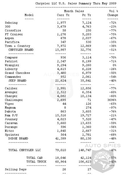 Compared to the same time period in 2008, Chrysler LLC's total sales decreased 47 percent. The Company finished the month with 260,407 units representing an 86 day supply. Inventory is down 37 percent compared with May 2008 when it totaled 412,009 units.