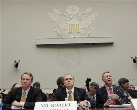 Today the CEOs of GM, Ford, and Chrysler, and the UAW president spent a second day testifying on Capitol Hill. This time before a House committee. They continued to plead their case of catastrophic national economic repercussions if they were allowed to fail. In response, the CEOs were chided by congress for taking corporate jets to Washington, and only one of the three admitted willingness to accept $1 salary in exchange for aid. That same executive, Robert Nardelli of Chrysler, also admitted bankruptcy was an option strongly considered for his company but felt likely to fail. He admitted Chrysler only has about $6 billion left.