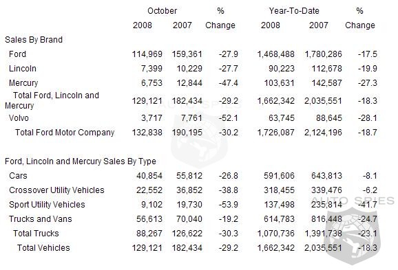Ford, Lincoln and Mercury sales totaled 129,121 in October, down 29 percent compared with a year ago.