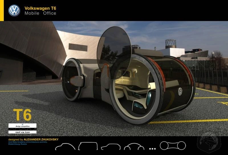 However, Alexander Zhukovski, a student designer from the Ural State Academy of Architecture and Arts in Ekatarinburg Russia thinks otherwise. Recognizing the busy rhythmic world of today, Zhukovsky has fused the two concepts of mobility and productivity in an extreme way to create this executive "office of the future". Paying homage to the VW Beetle and Transporter 1 bus for their iconic representation of the 50s-70s, Zhukovsky branded his roving office, T-6.
