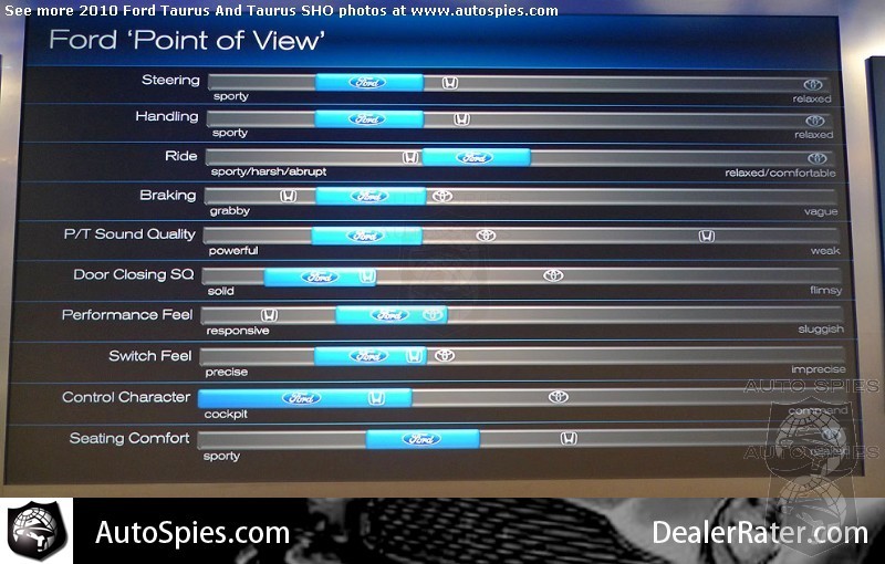 Even though we can’t give you our impression of the 2010 Ford Taurus until June 22nd. We CAN give you a clue on just how well we expect the Taurus to stack up against the competition. Ford’s crack team of designers of targeted the popular Honda Accord and Toyota’s Camry as the benchmark vehicles in this class, and gave us an idea on what to expect when they are compared. Of course Agent001 has already driven the new Taurus and will drive the SHO today, but we can’t talk about that just yet.Check out the handy comparison slide between the Taurus and the competition, and given these parameters are accurate tell us if Ford has scored a home run with the new Taurus.2010 Ford Taurus and Taurus SHO Photo GalleryAutoSpies.com Photo Galleries If you want to see your photos running on our homepage photo ticker, be sure to upload your photos on the go by sending them to Mobile@AutoSpies.com Share on Facebook