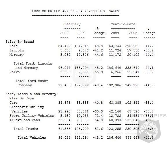 Coming off a strong February performance last year, Ford, Lincoln and Mercury February U.S. sales totaled 96,044, down 48 percent compared with a year ago. "The economic and competitive environment remains challenging," said Ken Czubay, Ford vice president, Sales and Marketing. "Ironically, these times provide the best opportunity to distance Ford from the competition. We're determined to stay on course and stay focused - building a foundation for future growth with distinctively styled products that offer consumers best-in-class quality, fuel economy, safety and value."