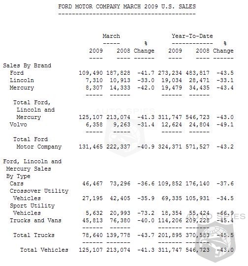 Ford, Lincoln and Mercury sales totaled 125,107 in March, down 41 percent compared with March 2008. Retail sales were down 36 percent compared with a year ago and fleet sales were down 50 percent.