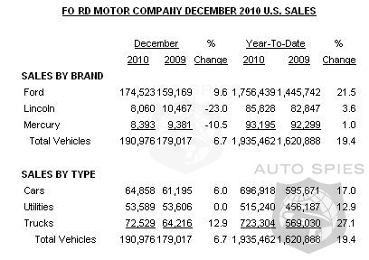- In 2010, Ford benefited from its full family of cars, utilities and trucks. For the year, cars were up 17 percent, utilities were up 13 percent and trucks were up 27 percent.