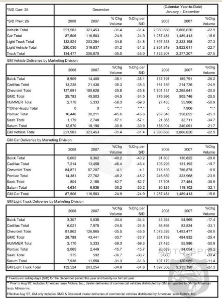 General Motors dealers in the United States delivered 221,983 vehicles in December, down 31 percent compared with a year ago. However, total deliveries were 67,000 vehicles more than November’s result, up more than 43 percent month over month. GM December car sales of 87,506 were off 25 percent and truck sales of 134,477 were down 35 percent compared with a year ago. For the year, GM delivered 2,980,688 vehicles while maintaining an expected market share just above 22 percent. Annual deliveries were down 23 percent compared with 2007, largely due to building weakness in the marketplace throughout the year spurred by economic headwinds such as the dramatic reduction in credit availability experienced in the fourth quarter, coupled with historically low levels of consumer confidence. Additionally, the American Axle strike and several supply disruptions impacted GM’s performance in the first half of the year.