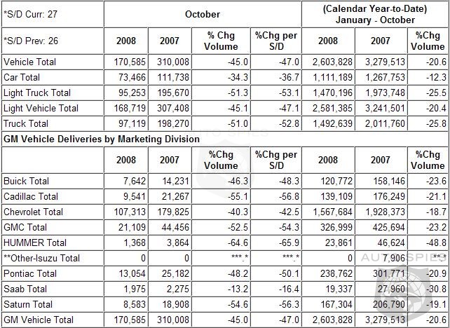General Motors dealers in the United States delivered 170,585 vehicles in October, down 45 percent compared with a year ago. GM truck sales of 97,119 were down 51 percent and car sales of 73,466 were off 34 percent. The steep decline in vehicle sales was largely due to a significant drop in the market’s retail demand as uncertainty over the deepening credit crisis impacted consumer confidence. “The market has been shrinking for three years, but in October we saw a dramatic decline for the industry and GM,” said Mark LaNeve, vice president, GM North America Vehicle Sales, Service and Marketing. “ We are obviously disappointed in our results which reflect a difficult comparison with a strong year-ago October performance. More importantly, it also reflects an unprecedented credit crunch that is dramatically impacting the entire U.S. economy – from the housing market to big and small companies to banks to family run businesses. The credit freeze has also had a very negative impact on consumers’ confidence and their purchase behavior across America.”