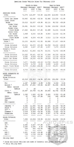 American Honda Motor Co., Inc., posted total February vehicle sales of 71,575, a decline of 35.4 percent compared to February 2008, based on the daily selling rate*. Honda Division posted February sales of 63,916, a decline of 34.9 percent versus February 2008. "The pattern that emerged a few months ago seems to be continuing," said Dick Colliver, executive vice president of sales for American Honda. "We hope, as spring beckons and the economy strengthens, sales will begin their upswing."