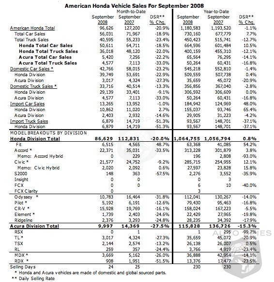 Honda Division posted September sales of 86,629, a decline of 20.0 percent versus September 2007. Honda total car sales decreased by 18.5 percent to 50,611. Honda light truck sales decreased 22.0 percent to 36,018. The Fit achieved a September record of 6,515, up 48.7 percent in its first full month available as a completely redesigned 2009 model.