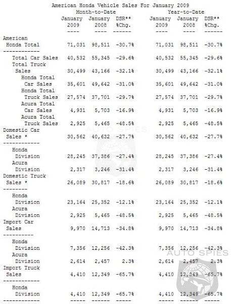American Honda Motor Co., Inc., posted January total vehicle sales of 71,031, a decline of 30.7 percent compared to January 2008. Honda Division posted January sales of 63,175, a decline of 30.5 percent versus January 2008 on a daily-selling rate* basis.