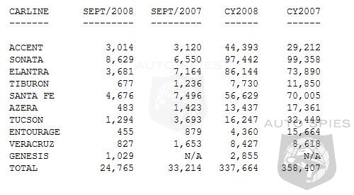 Hyundai Motor America today announced sales of 24,765 for the month of September, a 25 percent decrease from September 2007 levels.