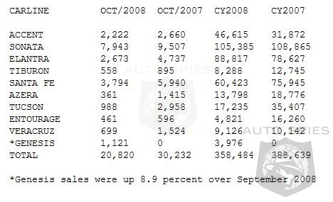 "We are experiencing one of the most challenging times in recent automotive history," said Dave Zuchowski, Hyundai Motor America's vice president of national sales. "We are encouraged by the prospects for November. With the financial markets beginning to stabilize and the election behind us, we believe consumer confidence will be bolstered and prospects who have been on the sidelines during this period of uncertainty will re-emerge into the market to help fuel the economic engine. With some of the most fuel-efficient and standard safety equipped vehicles in the industry we feel we are well positioned to get back on track."