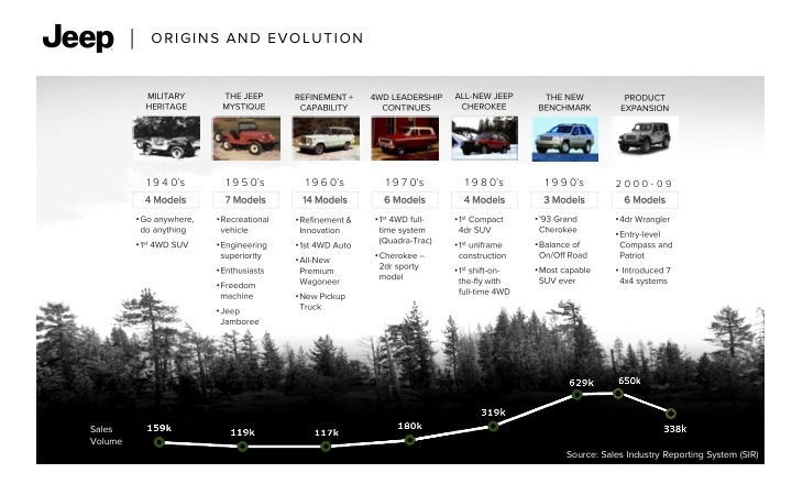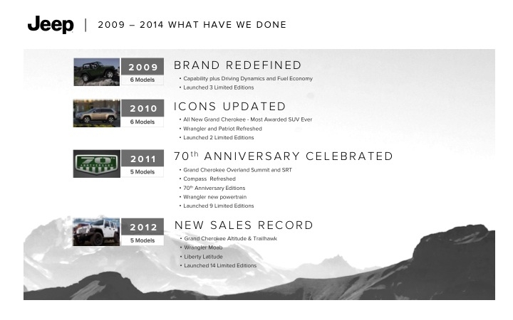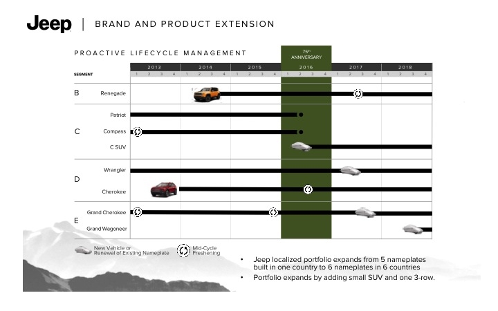 Chrysler CEO Sergio Marchionne has big plans for the iconic all road brand we have all of the details plus key slide from the Investor Presentation today.Jeep will start by adding a Grand Wagoneer three-row SUV in 2018, and will re-design the Wrangler and Grand Cherokee in 2017. The Jeep Renegade built in Europe will arrive stateside in early 2015, and both the Compass and Patriot will be replaced in 2016. A complete re-engineering of the Wrangler in will follow in 2017, with dramatic weight reduction, aerodynamics and powertrain improvements. The over all plan is to grow from 732,000 sales globally in 2014 to 1.9 million in 2018.