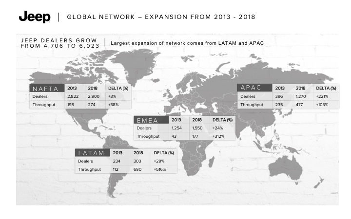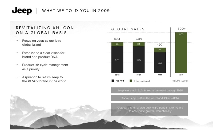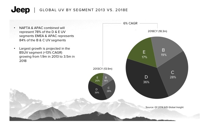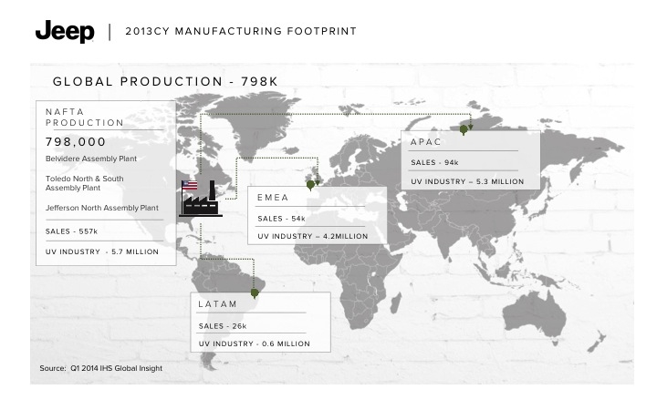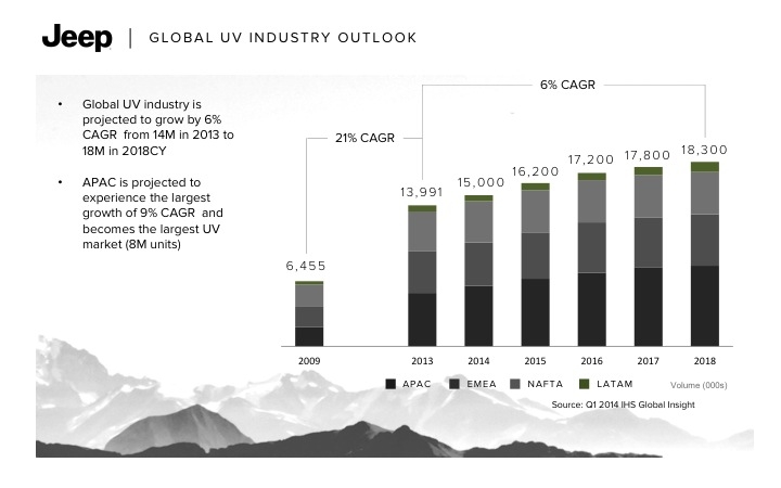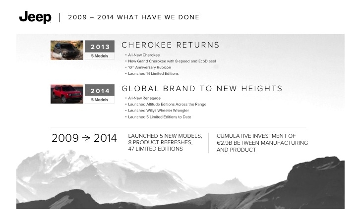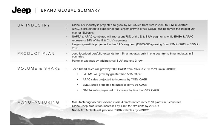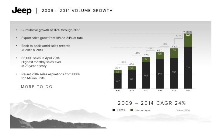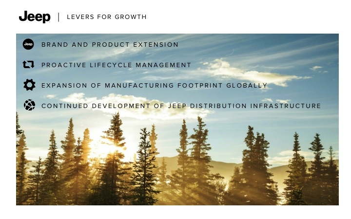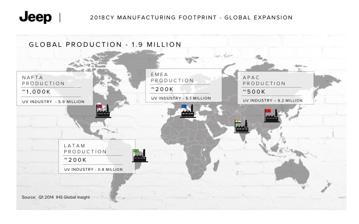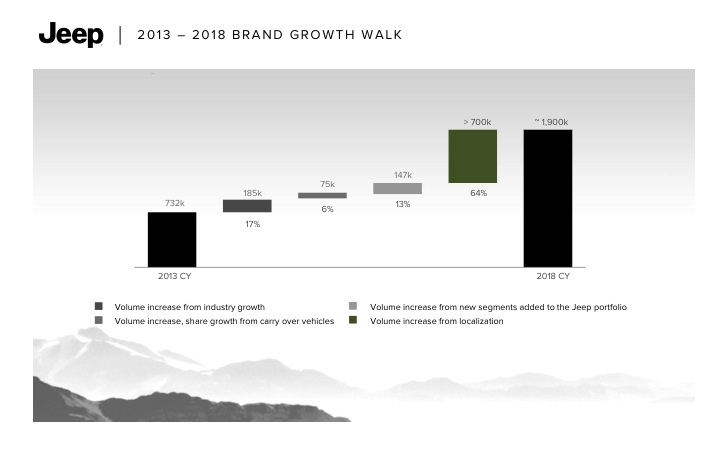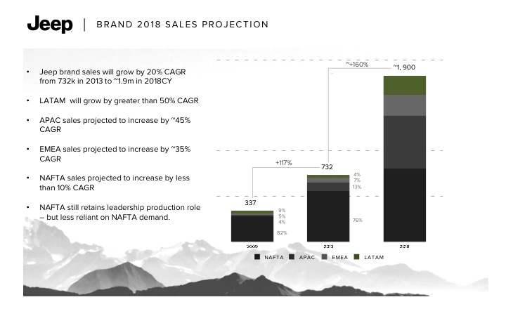 A complete re-engineering of the Wrangler in will follow in 2017, with dramatic weight reduction, aerodynamics and powertrain improvements. The over all plan is to grow from 732,000 sales globally in 2014 to 1.9 million in 2018.