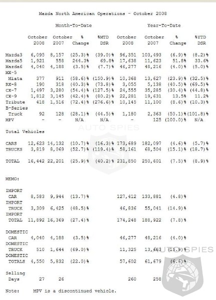 Mazda North American Operations today reported October 2008 sales of 16,442, down 25.9 percent versus last year, and year-to-date sales of 231,850, down 7.5 percent.
