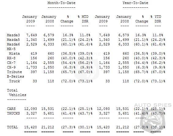 Mazda North American Operations (MNAO) today reported January 2009 sales of 15,420, down 27.3 percent versus last year. Leading the way for the month, MAZDA3 sales were up 16.3 percent over last year, while the all-new 2010 MAZDA3 arrives in dealerships across the country in the first quarter of this year.