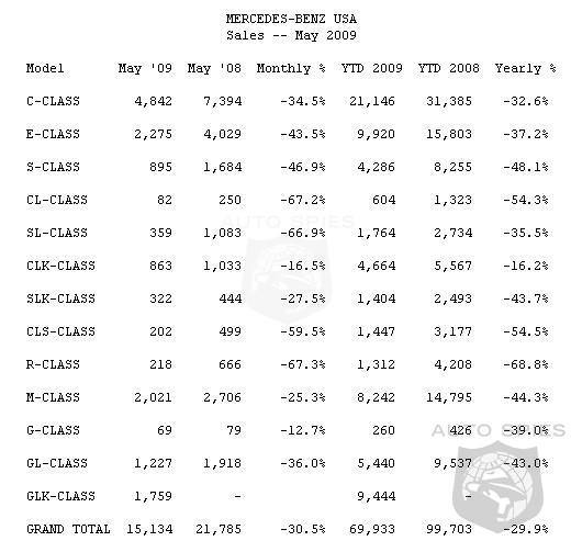 Mercedes-Benz USA (MBUSA) today reported May sales of 15,134 vehicles, a decline of 30.5 percent compared to May 2008. The volume leaders for the month were the C, E, and M-Class with sales of 4,842, 2,275, and 2,021 respectively.