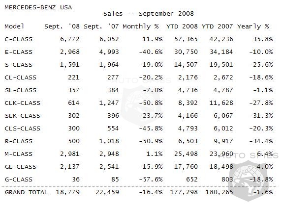 Mercedes-Benz USA (MBUSA) reported September sales of 18,779 vehicles, bringing the company's year-to-date volume to 177,298, a 1.6 percent decrease over its year-to-date record set last year. For the month, the Mercedes-Benz C-Class and M-Class model lines recorded gains of 11.9 percent and 1.1 percent respectively.
