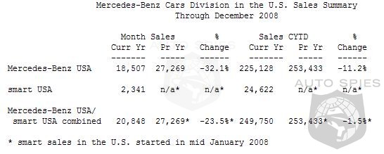 Daimler AG today reported sales for the Mercedes-Benz Cars division (Mercedes-Benz and smart combined) of 20,848 units in the U.S. for December 2008. All sales figures in this release are on an unadjusted basis unless otherwise noted. Mercedes-Benz USA (MBUSA) reported December sales of 18,507 vehicles, bringing the company's total 2008 volume to 225,128, an 11.2 percent decrease over last year's annual sales record. Sales of the C-Class model line rose 13.8 percent for the year, and sales of the M-Class SUV line-up increased by 1.3 percent.