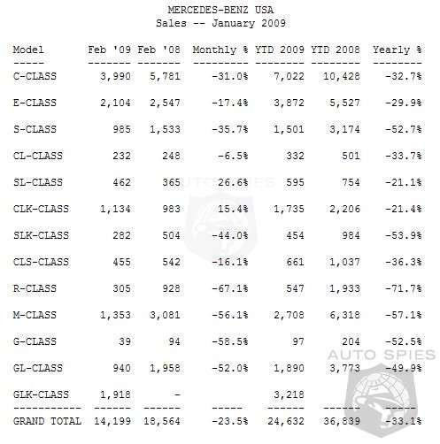 Daimler AG today reported sales for the Mercedes-Benz Cars division (Mercedes-Benz and smart combined) of 15,614 units in the U.S. for February 2009. All sales figures in this release are on an unadjusted basis unless otherwise noted. Mercedes-Benz USA (MBUSA) reported February sales of 14,199 vehicles. While sales for the month were down by 23.5 percent, the company's February volume put it ahead of its mainstream competitors for the month. A key contributor to February performance was the all-new 2010 GLK350, MBUSA's versatile, compact SUV, which made a strong showing during its first full month on the market with sales of 1,918. The GLK's February sales made it one of the company's top-selling models behind the C-Class (3,990) and E-Class (2,104). On a year-to-date basis, MBUSA reported sales of 24,632, a decrease of 33.1 percent over the 36,839 vehicles sold during the comparable period in 2008.