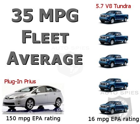 The math is pretty simple. For every plug-in Prius that Toyota sells (which could be rated as high as the Volt, which Chevy claims at 150 mpg) they can sell 5 Tundras with “fuel economy” room to spare (see graphic). Using EPA ratings of 16 mpg for the Tundra and 150 mpg for the plug-in Prius, the “fleet average” is 38.33 mpg! That’s what Obama means when he talks about “super credits” - super credits mean that SELLING ONE PLUGIN-IN IS GOING TO BE "SUPER" FOR TRUCK SALES.