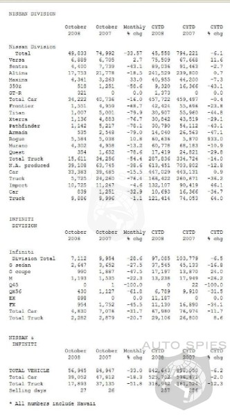 -- Nissan vehicles saw sales of 49,833 units in October compared with October 2007's 74,992 units sold, a 33.5 percent decrease.