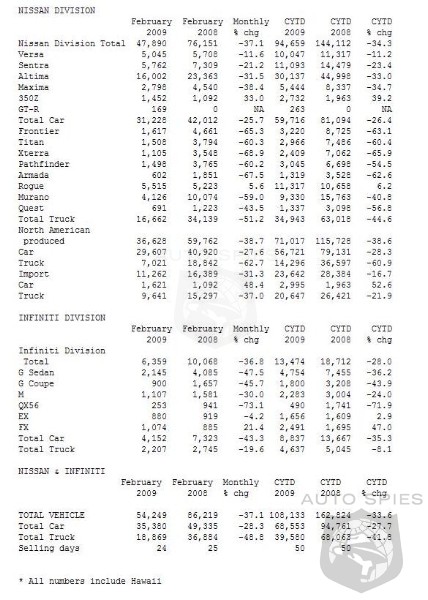 Nissan North America, Inc. today reported sales for February of 54,249 units versus 86,219 units a year ago, a decrease of 37.1 percent. Sales of Nissan Division vehicles decreased 37.1 percent, while sales of Infiniti vehicles decreased by 36.8 percent. NNA INFORMATION