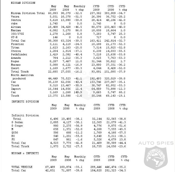 - Nissan vehicles saw sales of 60,993 units in May compared with 90,379 units sold in May 2008, a 32.5 percent decrease.