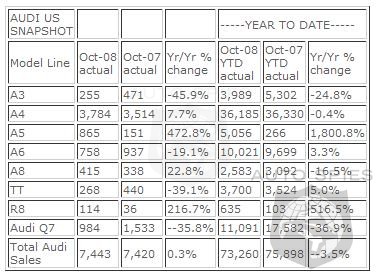 Following its late-September release, the all-new 2009 Audi A4 confirmed strong consumer interest in its first full month of sales reporting, with 3,784 units sold. Dealers also reported strong demand for the Audi A5 coupe, posting a third consecutive month of record sales with 865 units sold. De Nysschen also noted that dealers have nearly sold out 2008 model year inventory, setting Audi up for growth on the heels of the A4 launch and the forthcoming Audi Q5 in early 2009.