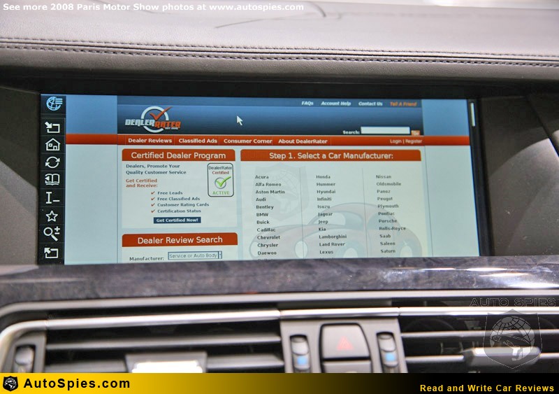 Can you really get to your favorite site with BMW's in car internet service? Well 001 jumped into the new 7 Series in Paris and gave it a whirl.As you can see he had little trouble pulling up both AutoSpies and DealerRater on the in car screen. After those two picks where else would you want to go? See The Latest Photos In Our 2008 Paris Motor Show Gallery
