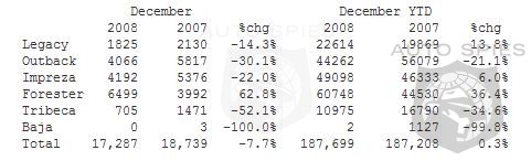 Subaru of America today announced a 0.3% sales increase for full-year 2008 sales over 2007. Driven by record results for its Impreza, Legacy and Forester model lines, Subaru was the only full-line brand with positive sales through November 2008. (Full-year results for other makers are not known at time of posting). The year-over-year sales increase adds to the good news the company enjoyed in 2008: the Subaru Forester was named 2009 Motor Trend Sport/Utility of the Year and the company was awarded the title Automotive Marketer of the Year by Mediapost.com and the brand has performed well in Kelley Blue Book and ALG ratings.