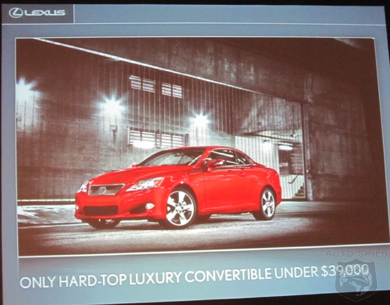 We weren't able to give you the full details and all our photos of the new 2010 Lexus IS-C until now, due to a Lexus press embargo.So here are the full details and photos of the ONLY luxury convertible with an MSRP of under $39,000.You definitely have to drive it to see the amazing refinement Lexus has engineered into this car from the top, the drive, useable storage even with the top down and the quality.It won't surprise us if traditional Mercedes SL customers flock to this car because the pricing and package is more 'responsible' in these uncertain economic times.Plus if you drive the 'F-Sport' fitted IS-C, you may end up buying it over the IS-F.That was our favorite of the cars we tested.The forecast is to sell 20k units of the IS-C in the USA and they should make that goal easily.Look for the full review coming soon from Agent 00R.2010 Lexus IS-C And HS250H Photo GalleryLexus Official IS-C 'Live a Little' Microsite2010 Lexus IS-C And HS250H Photo Gallery2009 Lexus LX570 Photo Gallery2009 BimmerFest Photo Gallery2010 Mercedes-Benz E-Class Photo GalleryIf you want to see your photos running on our homepage photo ticker, be sure to upload your photos on the go by sending them to Mobile@AutoSpies.comThere are photos and then there are AutoSpies.com photos!AutoSpies.com is ranked number one on Google search for auto shows