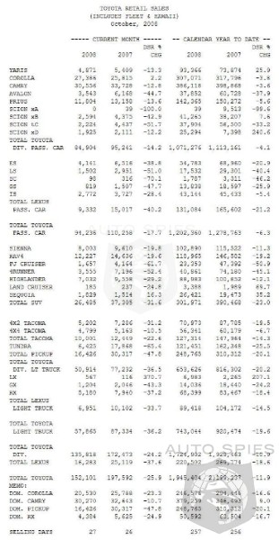 The Toyota Division posted October sales of 135,818 units, a decrease of 24.2 percent from last October. The Lexus Division reported October sales of 16,283 units, a decrease of 37.6 percent from the year-ago month.