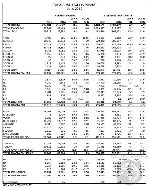Toyota Motor Sales USA Inc today reported July 2015 sales of 217,181 units, an increase of 0.6 percent from July 2014 on a volume basis. With the same amount of selling days in July 2015 as in July 2014, sales were up 0.6 percent on a daily selling rate (DSR) basis.