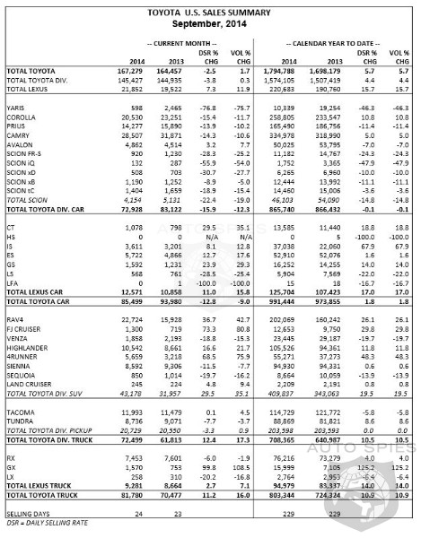 Toyota, Scion and Lexus today reported total September 2014 sales results of 167,279 units, an increase of 1.7 percent over September 2013 on a raw-volume basis unadjusted for 24 selling days this period versus 23 last year.
