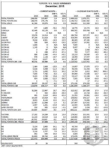Toyota Motor Sales (TMS), U.S.A., Inc., today reported December 2015 sales of 238,350, an increase of 10.8 percent from December 2014 on a volume basis. With two additional selling days in December of 2015, sales were up 2.9 percent on a daily selling rate (DSR) basis.