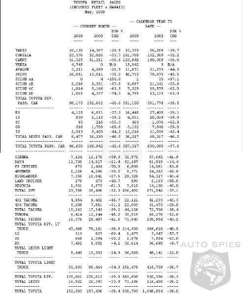 The Toyota Division posted May sales of 135,661 units, a decrease of 39.0 percent from the same period last year. The Lexus Division reported May sales of 16,922 units, a decrease of 33.9 percent from the year-ago month.