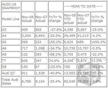 "Despite the great challenges facing the auto industry, Audi continues to outperform other automakers on the strength of several new products," said Johan de Nysschen, executive vice president, Audi of America. "At Audi we will continue to be aggressive as we look forward to introducing new progressive vehicles in 2009, such as the Audi Q5 and the Audi Q7 TDI."
