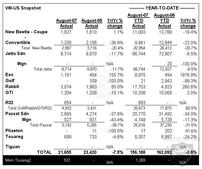 Volkswagen of America, Inc. today announced August 2007 sales of 21,655 vehicles, representing a decrease of 7.5 percent over August 2006 unit sales of 23,420. On a year-to-date basis, Volkswagen brand vehicle sales are down 3.6 percent through August.