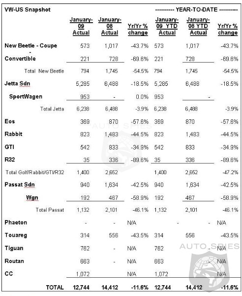 Volkswagen of America, Inc. today announced January 2009 sales of 12,744 units, a 11.6 percent decrease over January 2008 sale of 14,412 units. Volkswagen’s stylish new CC, which was designed to blend sports car dynamics and dimensions with sedan comfort, posted its best sales month since its market introduction last September with more than 1,000 units sold.