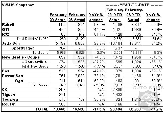 Volkswagen of America, Inc. today announced February 2009 sales of 13,660 units, a 17.5 percent decrease over February 2008 sale of 16,556 units. Volkswagen’s stylish new CC, which was designed to blend sports car dynamics and dimensions with sedan comfort, posted its best sales month ever with more than 1,800 units sold.