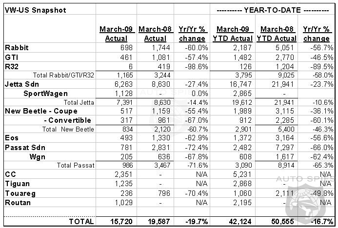 Volkswagen of America, Inc. today announced March 2009 sales of 15,720 units, a 19.7 percent decrease over March 2008 sale of 19,587 units.
