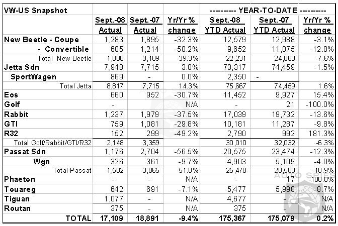 Volkswagen of America, Inc. today announced September 2008 sales of 17,109 units, a 9.4 percent decrease over the September 2007 sales of 18,891 vehicles. On a year-to-date basis, 2008 Volkswagen sales are 0.2 percent ahead of 2007 sales through September. “This is the toughest economy we’ve seen in a long time” said Mark Barnes, COO, Volkswagen of America, Inc. “We’re extremely pleased that we are still ahead of last years sales. With the arrival of our all-new luxurious CC and our seven passenger minivan, Routan, which are arriving in dealerships now, combined with our other new products launched earlier this year, such as our 50-state compliant clean diesel Jetta TDI, we see opportunity to continue to grow our business.”