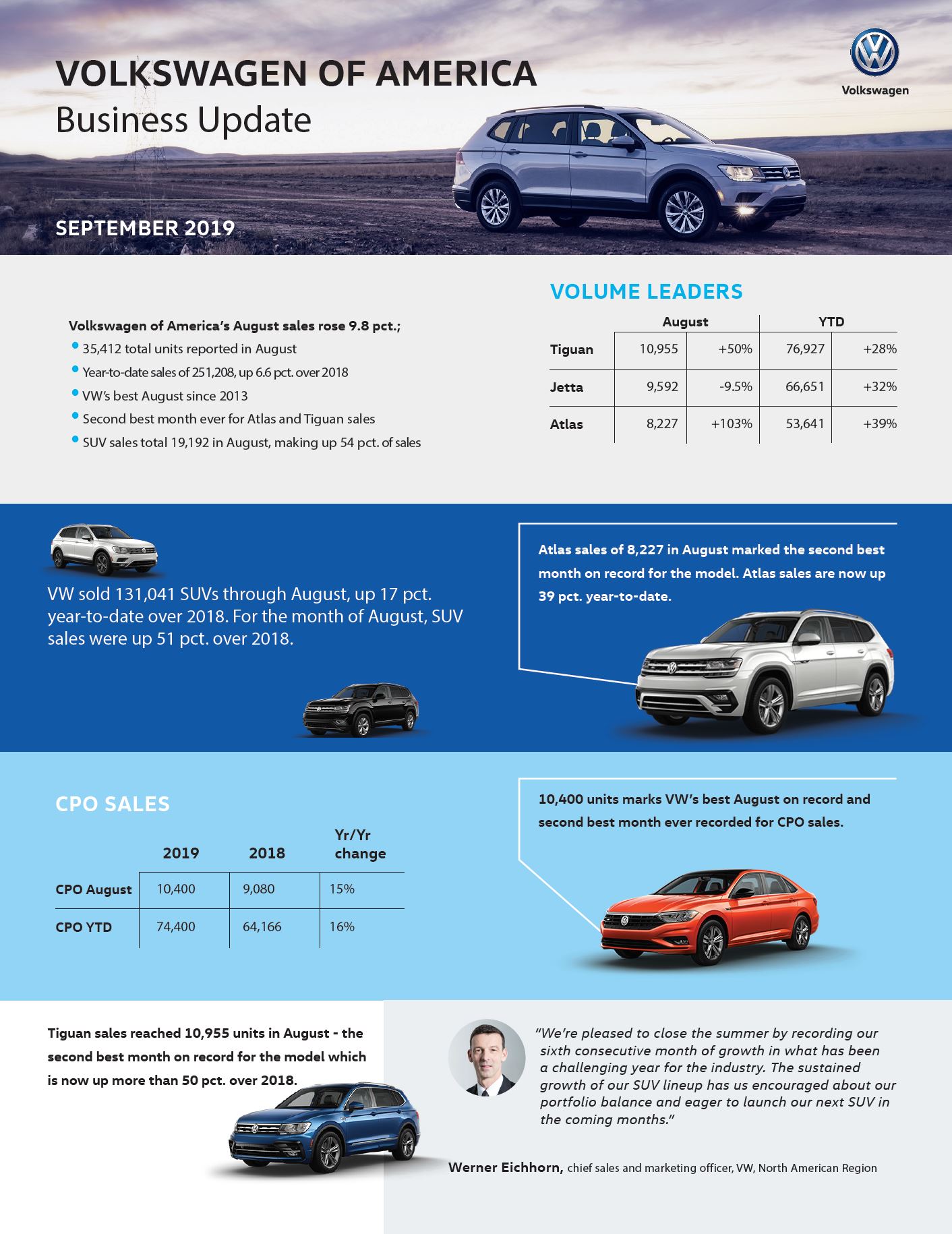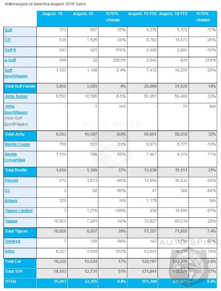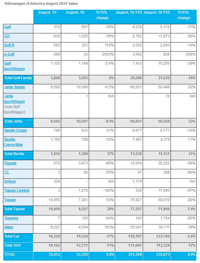 Volkswagen of America, Inc. (VWoA) today reported sales of 35,412 units delivered in August 2019. This marks a 9.8 percent increase over August 2018.