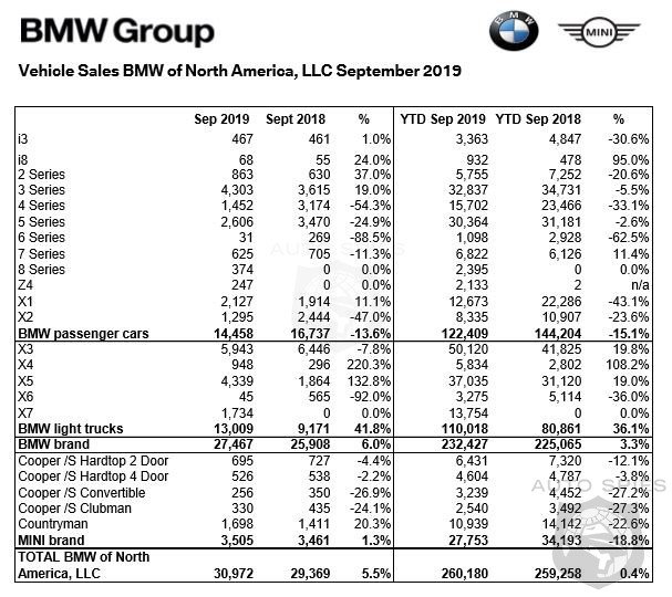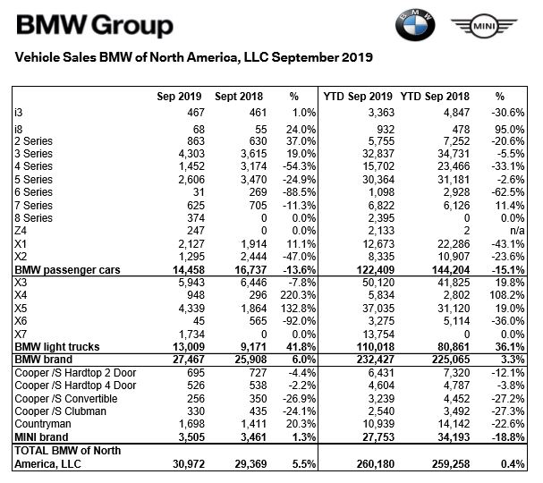 MW brand sales totaled 27,467 vehicles in September 2019, an increase of 6.0 percent over the 25,908 vehicles sold in September 2018. Year-to-date, BMW brand sales in the U.S. are up 3.3 percent. “With September’s results, we have now achieved positive sales growth in 24 of the past 25 months,” said Bernhard Kuhnt, president and CEO, BMW of North America. “We thank our customers for their continued confidence in our new products and look ahead to year-end, with a focus on maintaining the momentum that our dealer network has built with us over this time.”