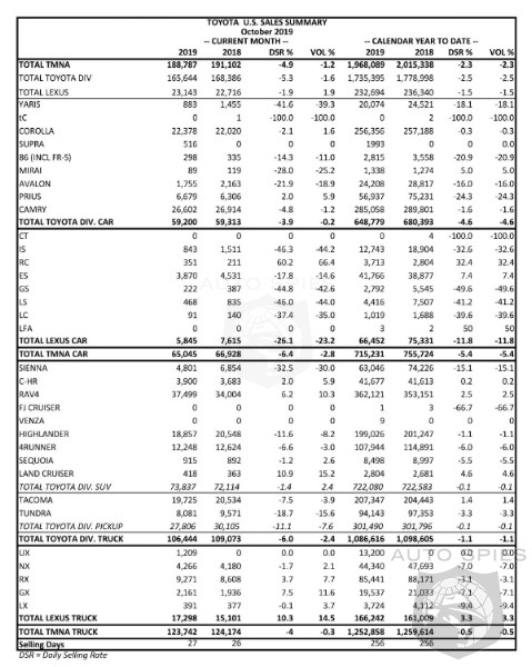 Toyota Motor North America (TMNA) today reported October 2019 sales of 188,787 vehicles, a decrease of 1.2 percent on a volume basis and down 4.9 percent on a daily selling rate (DSR) basis versus October 2018. Toyota division posted October sales of 165,644 units, down 1.6 percent on a volume basis and down 5.3 percent on a DSR basis.