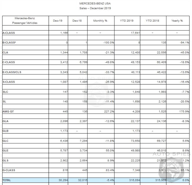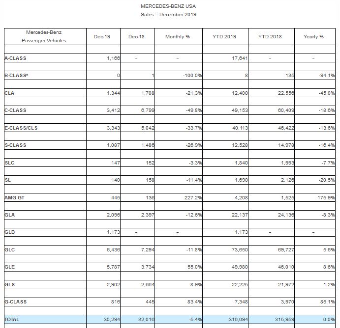 Mercedes-Benz USA (MBUSA) today reported December sales of 30,294 Mercedes-Benz models. Additionally, Mercedes-Benz Vans recorded December sales of 4,985, bringing MBUSA to a grand total of 35,279 vehicles for the month. On a year-to-date basis, MBUSA recorded sales of 316,094 Mercedes-Benz passenger vehicles and 41,635 Vans. This brings MBUSA’s total year-to-date sales to 357,729 units, surpassing last year’s volume by 1.0%.